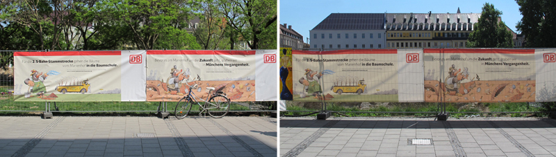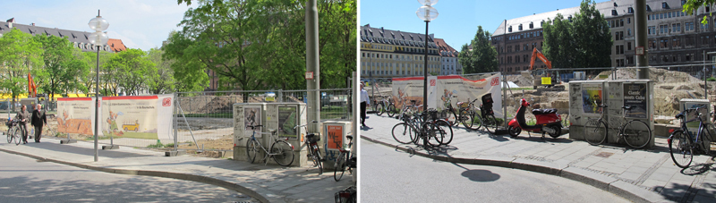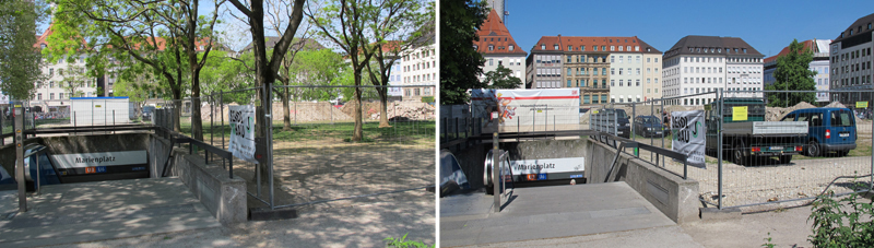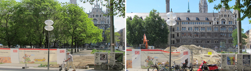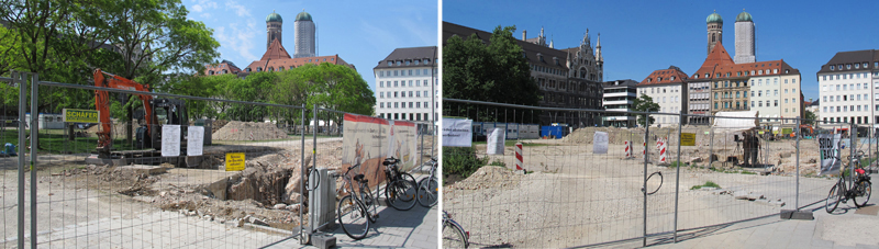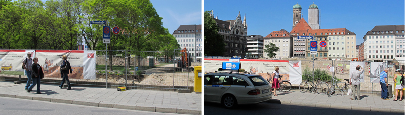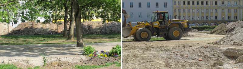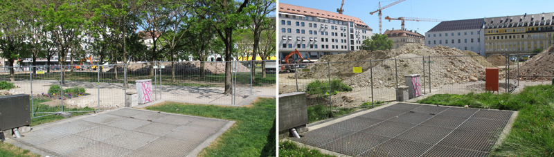 Die Bildvergleiche entstanden am 2. Mai 2011 (als der Bauzaun schon aufgestellt war) und am 29. Juni 2011 (da waren die Bäume schon ausgegraben).